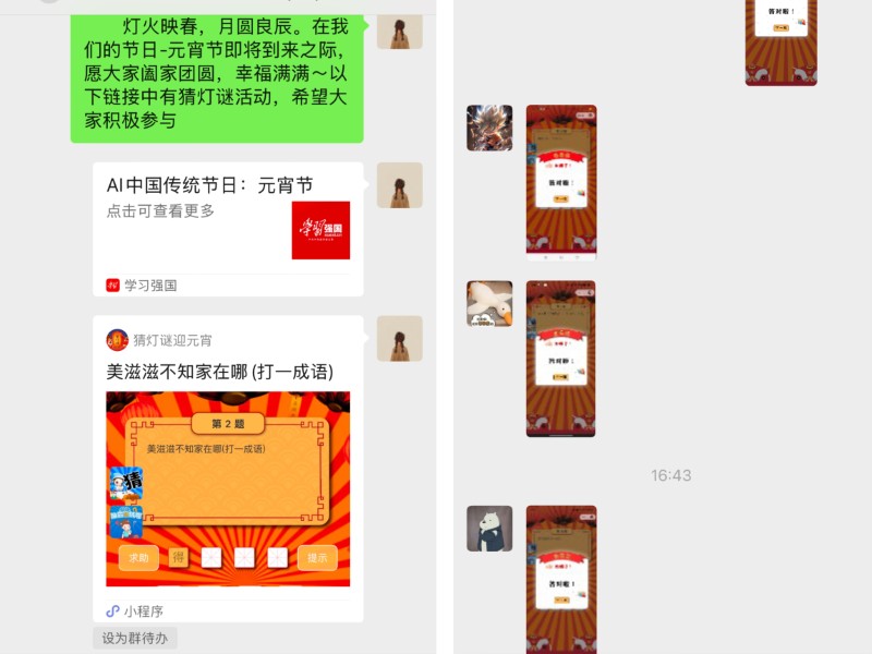 2月11日,八公司黨支部聯(lián)合太原城建工程有限公司黨支部、租賃公司黨支部、安裝公司黨支部、物業(yè)公司黨支部分別開展線上猜燈謎活動(dòng)。謎題豐富多樣,涵蓋文化、體育、娛樂、年俗及筑路機(jī)械專業(yè)知識(shí)等多個(gè)領(lǐng)域,不僅讓職工在猜謎中深切感受了傳統(tǒng)節(jié)日的獨(dú)特魅力,還鍛煉了大家的思維能力和概括能力,營造出歡樂祥和、團(tuán)圓幸福的濃厚氛圍。