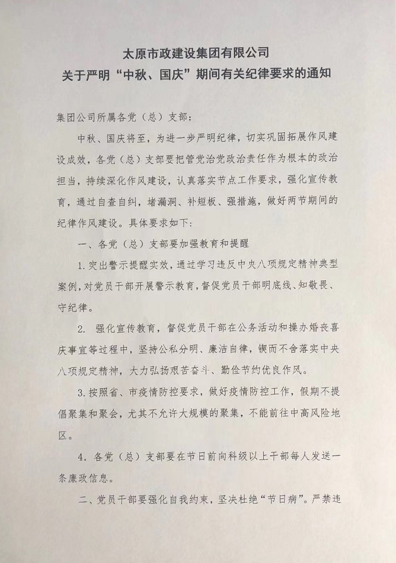 太原市政建設(shè)集團(tuán)有限公司關(guān)于嚴(yán)明“中秋、國慶”期間有關(guān)紀(jì)律要求的通知