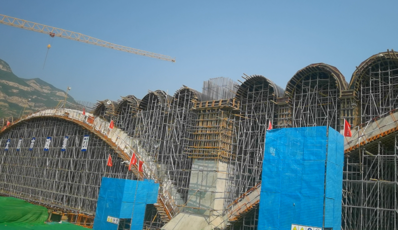 該橋采用單跨72米連續(xù)5跨設計,主腹拱作為橋梁的核心承重結構,是此次橋梁施工的核心節(jié)點,項目團隊順利克服弧形施工、模板一次成型、大體量澆筑、五跨精準落架等挑戰(zhàn),以“毫米級”精度貫穿施工全過程,為橋梁成型打造堅實“筋骨”。