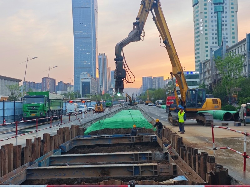 “追求精細(xì)極致,鑄就基坑支護(hù)的穩(wěn)固防線”。項(xiàng)目部將鋼板樁施打質(zhì)量視為確?;影踩c質(zhì)量的關(guān)鍵環(huán)節(jié),嚴(yán)格執(zhí)行材料準(zhǔn)入制度,所有進(jìn)場(chǎng)鋼板樁均經(jīng)過(guò)材質(zhì)證明核查、尺寸精度測(cè)量和外觀質(zhì)量檢驗(yàn)三重把關(guān),確保樁身無(wú)裂紋、無(wú)銹蝕等質(zhì)量缺陷,從源頭上杜絕不合格材料。施工中,施工人員采用全站儀進(jìn)行動(dòng)態(tài)監(jiān)測(cè),嚴(yán)格控制樁身垂直度偏差在規(guī)定范圍內(nèi),詳細(xì)記錄每根樁的打入深度、貫入度等關(guān)鍵參數(shù)。拔樁階段采用專用施工設(shè)備,按照“先支后拆、分段拔除”的原則有序進(jìn)行,拔樁后出現(xiàn)的孔隙立即灌砂,最大限度減少對(duì)周邊土體的擾動(dòng),實(shí)現(xiàn)平穩(wěn)施工與環(huán)境保護(hù)的和諧統(tǒng)一。